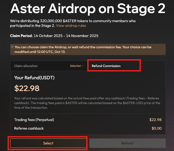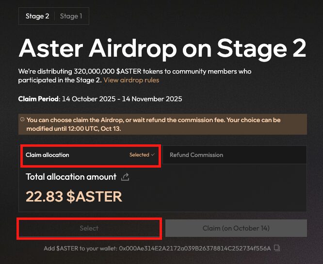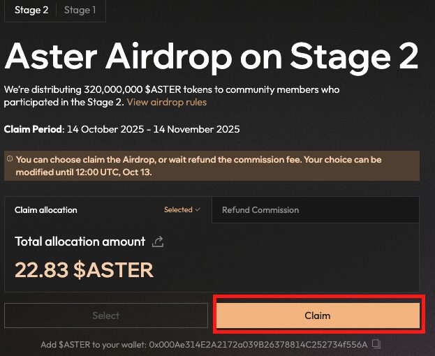 Aster Stage 2は10月13日までにAsterで受け取るかUSDTで受け取るかの選択が必要ですのでまだの方はすぐに選択してください。