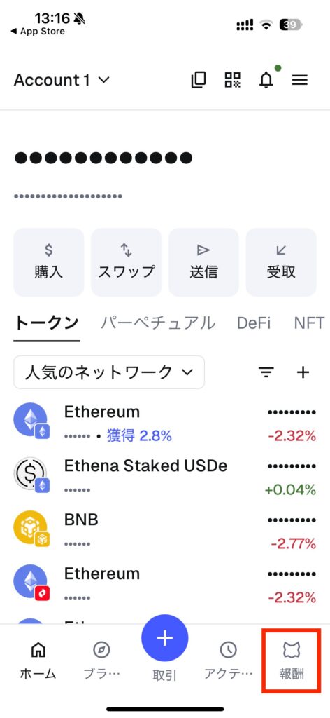 またはスマホでメタマスクアプリを開いて右したの報酬をタップしてください。