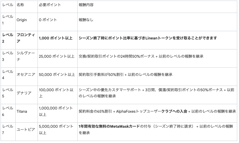 レベル2の1000ポイントまでポイントを貯めるとシーズン終了時にポイント比率に基づきLineanトークンを受け取ることができますので一つの目安になるかなと思いもます。