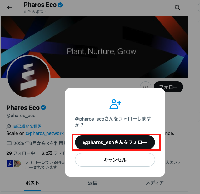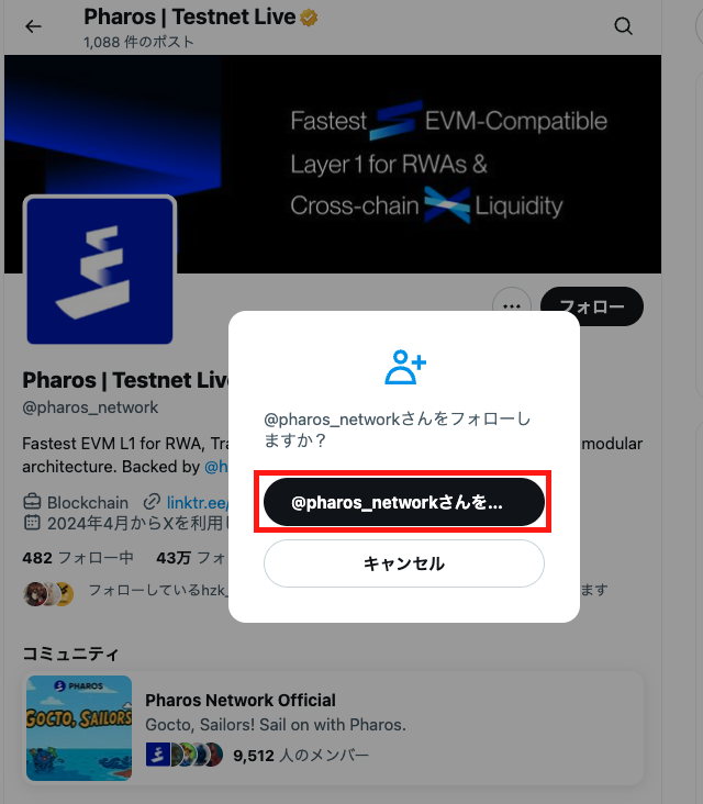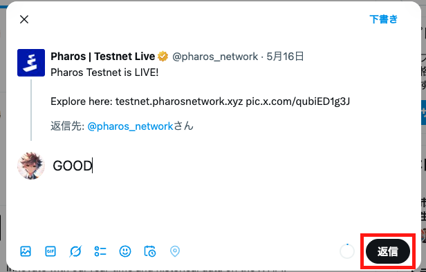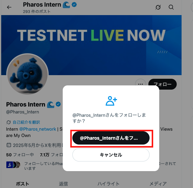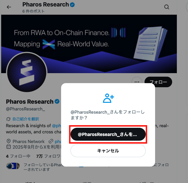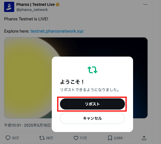 「リツイート」ボタンをクリックするとXに飛びますので、Pharosの公式投稿をリポスト(旧リツイート)してください。
