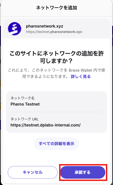 この時、ウォレット内でネットワークの追加や切り替えの承認を求められることがありますので、しっかり確認して「承認する」をクリックしてください。