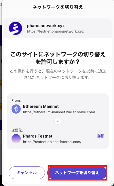 ここで「Switch network」または「ネットワークを切り替える」をクリックして、Pharosのテストネット環境にウォレットを接続します。