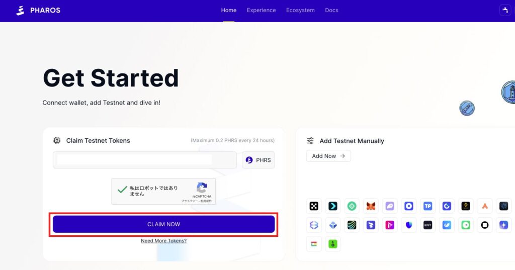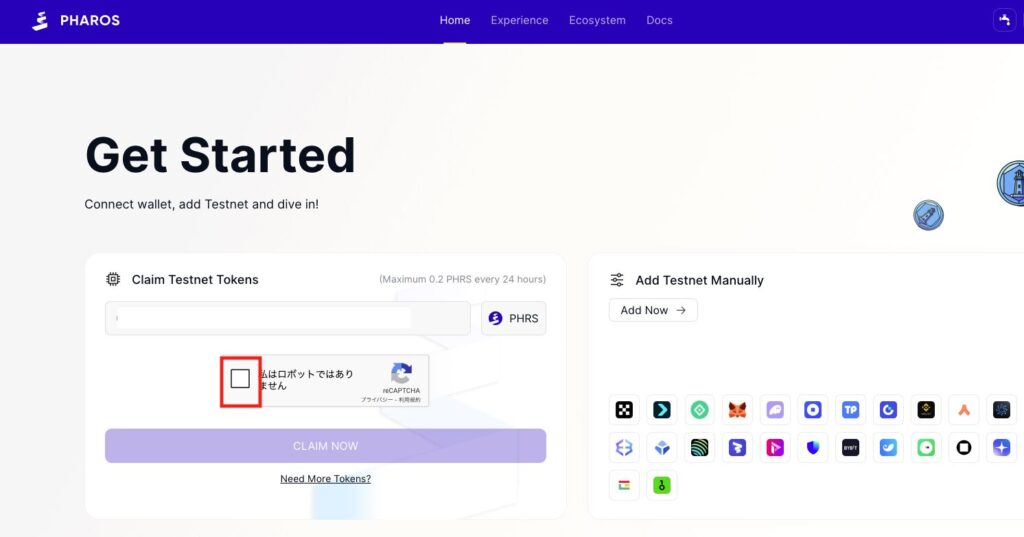 ウォレットの接続が完了したら、次にPharosテストネットで取引を行うための「テストネットトークン」を手に入れましょう。
