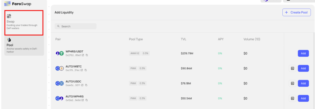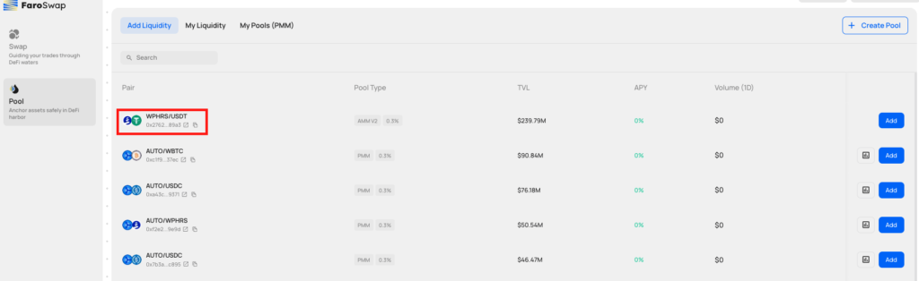 今回はFaroSwapのWPHRS/USDTにLiquidityを追加していきます。