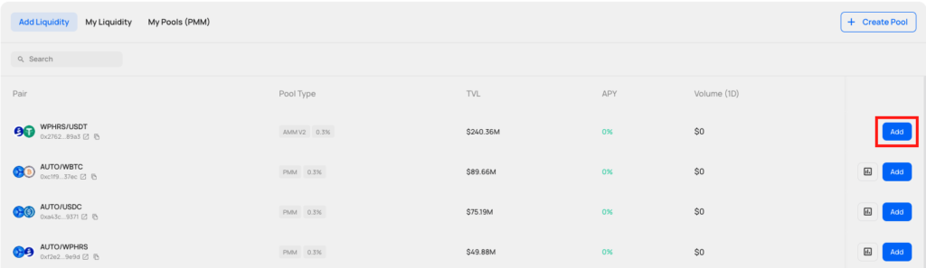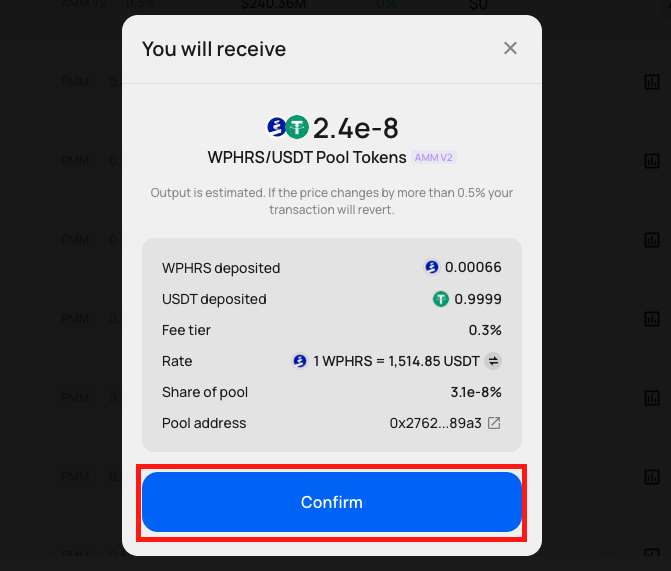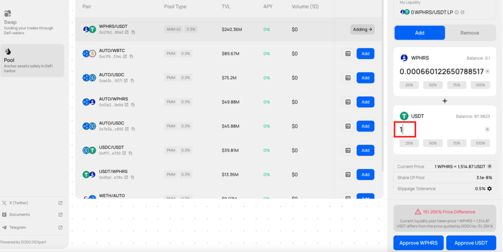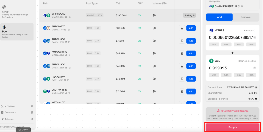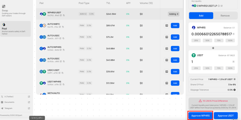 WPHRSとUSDTが準備できたので先ほどのPoolのページに戻ってください。