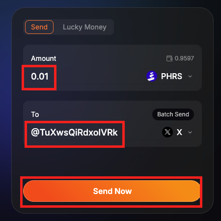 送りたいトークンの量を入力してXのユーザーネームを入力してSend Nowをクリックしてウォレットで承認すれば完了です。