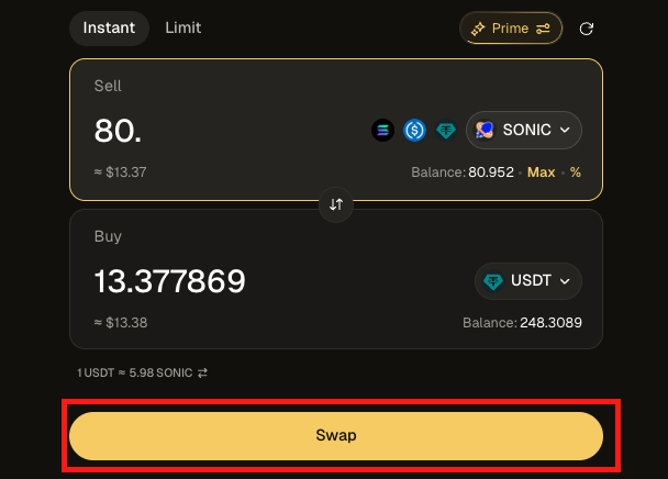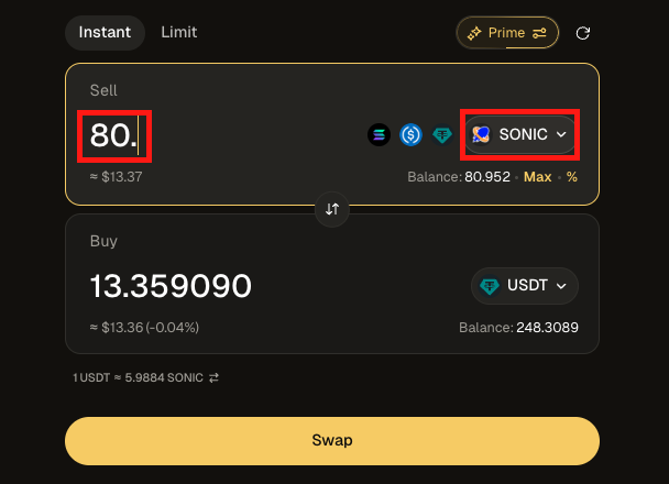 Sellの通貨をSONICに変更して売りたい数量を入力してください。