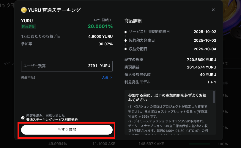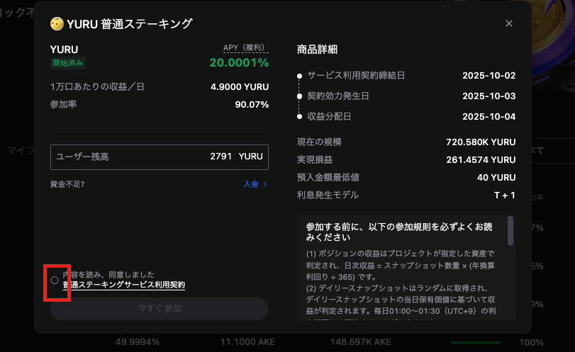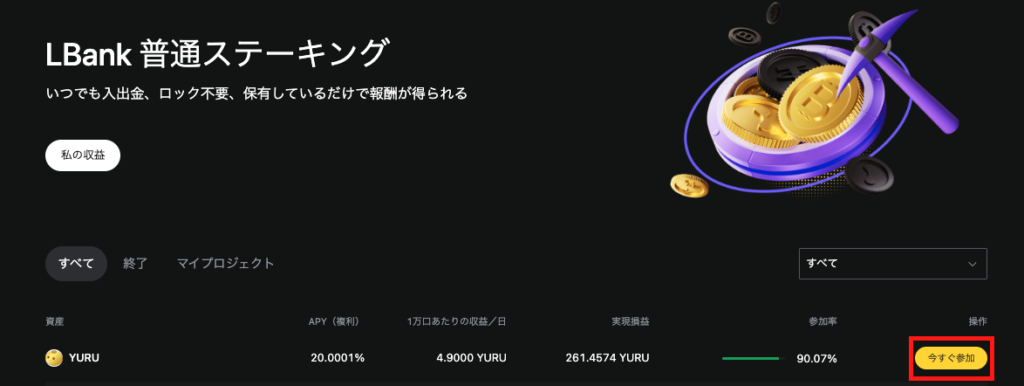 ゆるコインステーキング方法 ゆるコイン X Facebook はてブ Pocket LINE コピー 2025.10.02 こんにちはGURIです。 ゆるコイン待望のステーキングがLBankにてスタートしましたのでステーキング方法を解説します。 LBankの開設がまだの方はこちらの記事を参考に開設してみてください。 【PC版】LBankで「ゆるコイン」を売買する方法!口座開設から取引まで徹底解説「あの話題の"ゆるコイン"、日本の取引所にはない…」「LBankっていう取引所が良いらしいけど、海外サイトだから不安…」... ステーキング方法 LBankにアクセスしてください。 資産運用クリックして普通ステーキングを選択してください。 YURUの今すぐ参加をクリックしてください。 同意するをクリックしてください。 今すぐ参加をクリックしてください。 以上です。 お疲れ様でした。